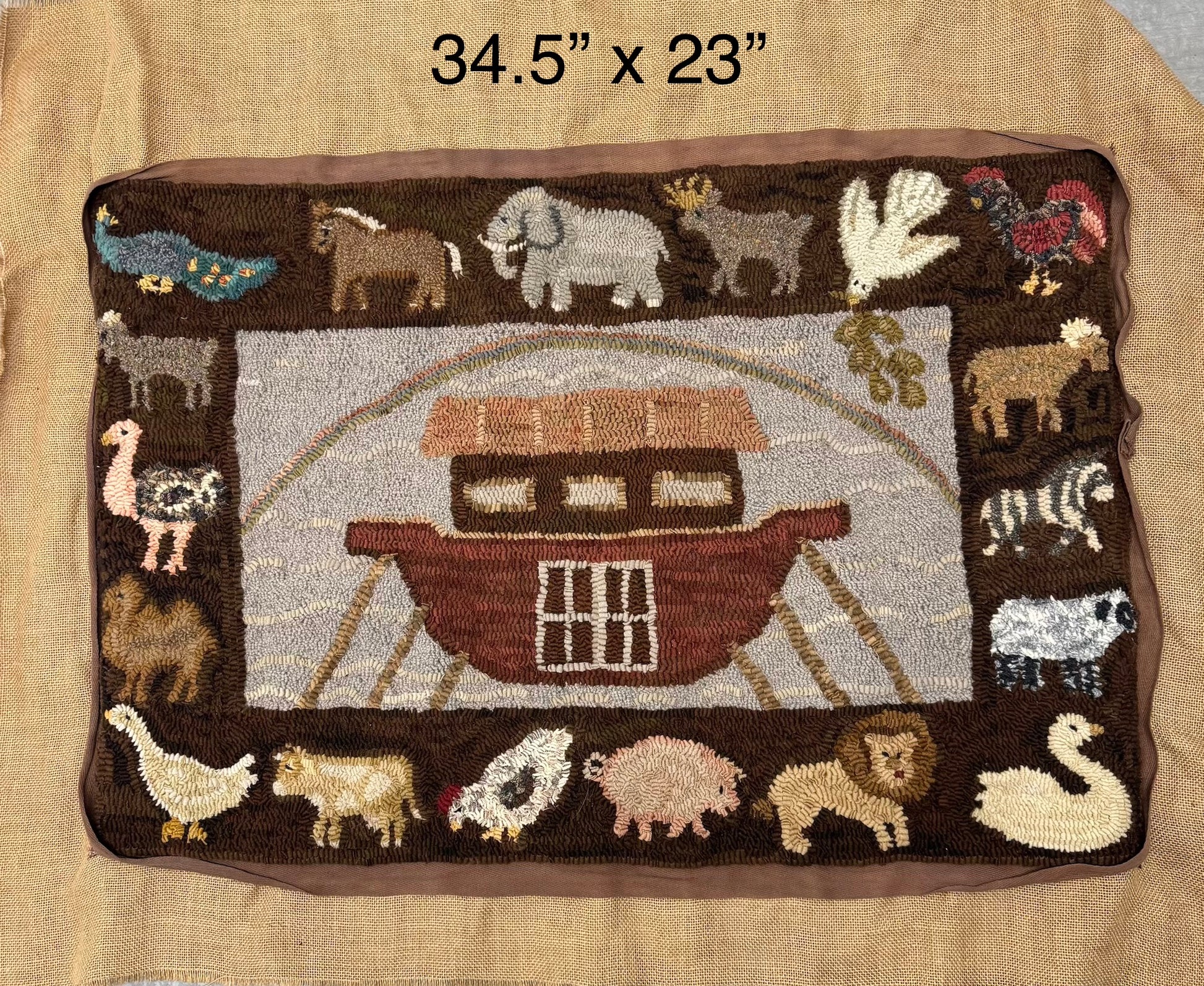 Charming Noah's Ark Rug hand hooked with wide cut wool strips that needs the final finishing. The twill tape is sewn to the edge of the hooking, Just serge the burlap and tack down the tape. The rug measures 34.5" x 23".