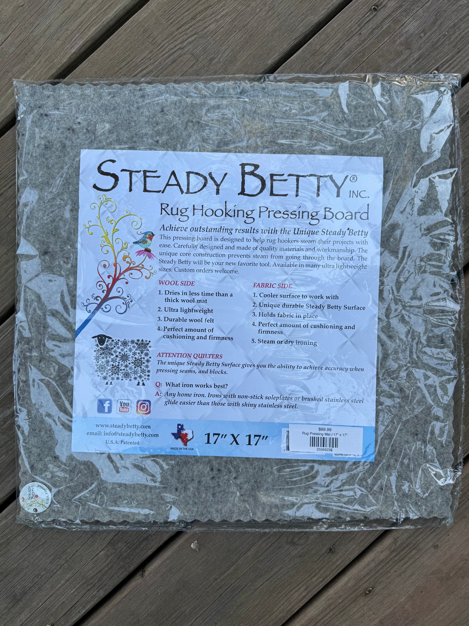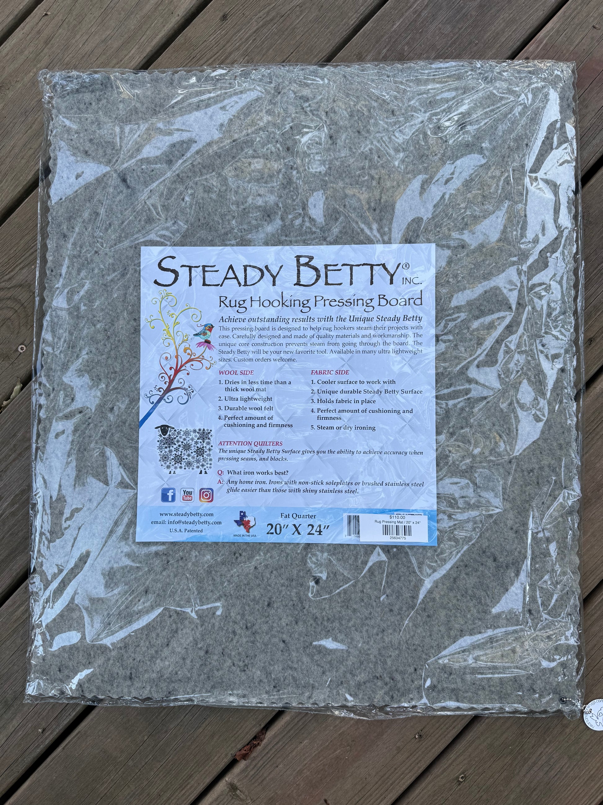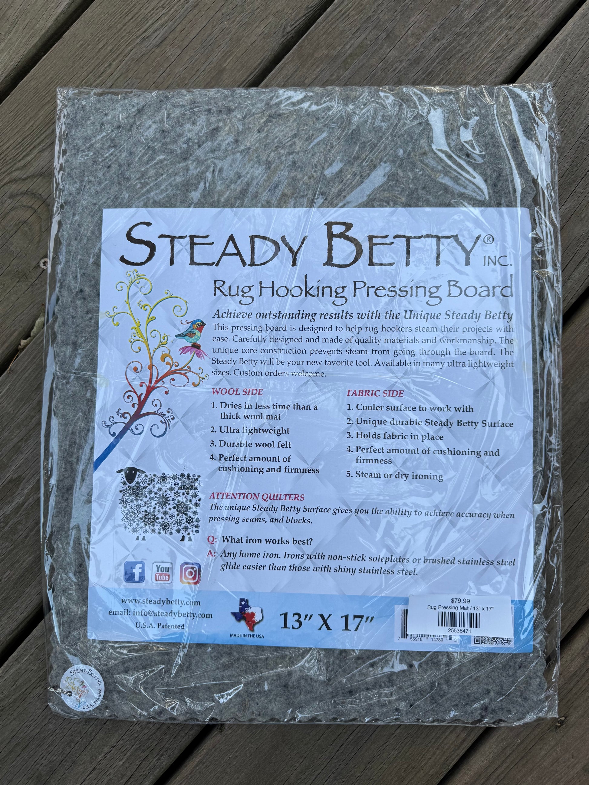 The Steady Betty for rug hooking is a unique pressing board with a foam like surface that will hold your rug perfectly still while you steam your completed project. The Steady Betty's unique core construction prevents any steam from going through the board. The design of our boards allows the pressing surface to dry quickly leaving much less moisture than a typical wool mat.